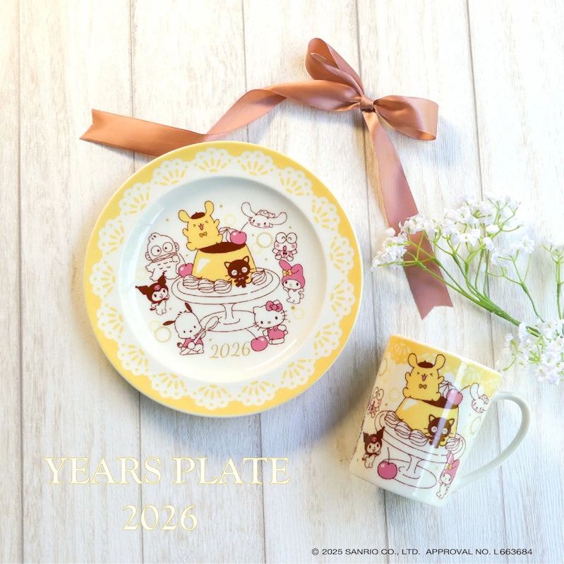大きなプリンを囲んでサンリオキャラクターズのみんながお祝いしている楽しい柄がイヤーズプレートとマグになりました!